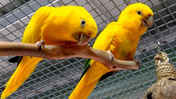 Bonded breeding pair of Guaruba guarouba (Golden Conure).