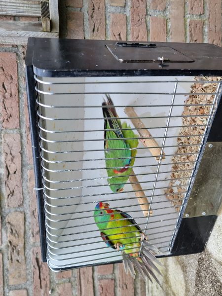 De vogels zitten binnen en buiten in de voliere en alle split fadads zijn correct geringd